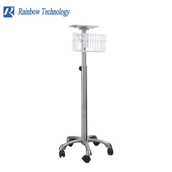 Rainbow's Patient Monitor Trolley has a load capacity of 30kg, and 5 wheels for easy maneuverability. The handle is foldable for easy storage. It is suitable for use in hospitals as a stretcher trolley, trolley stretcher, patient bedside trolley, medical monitor trolley, and monitor trolley.